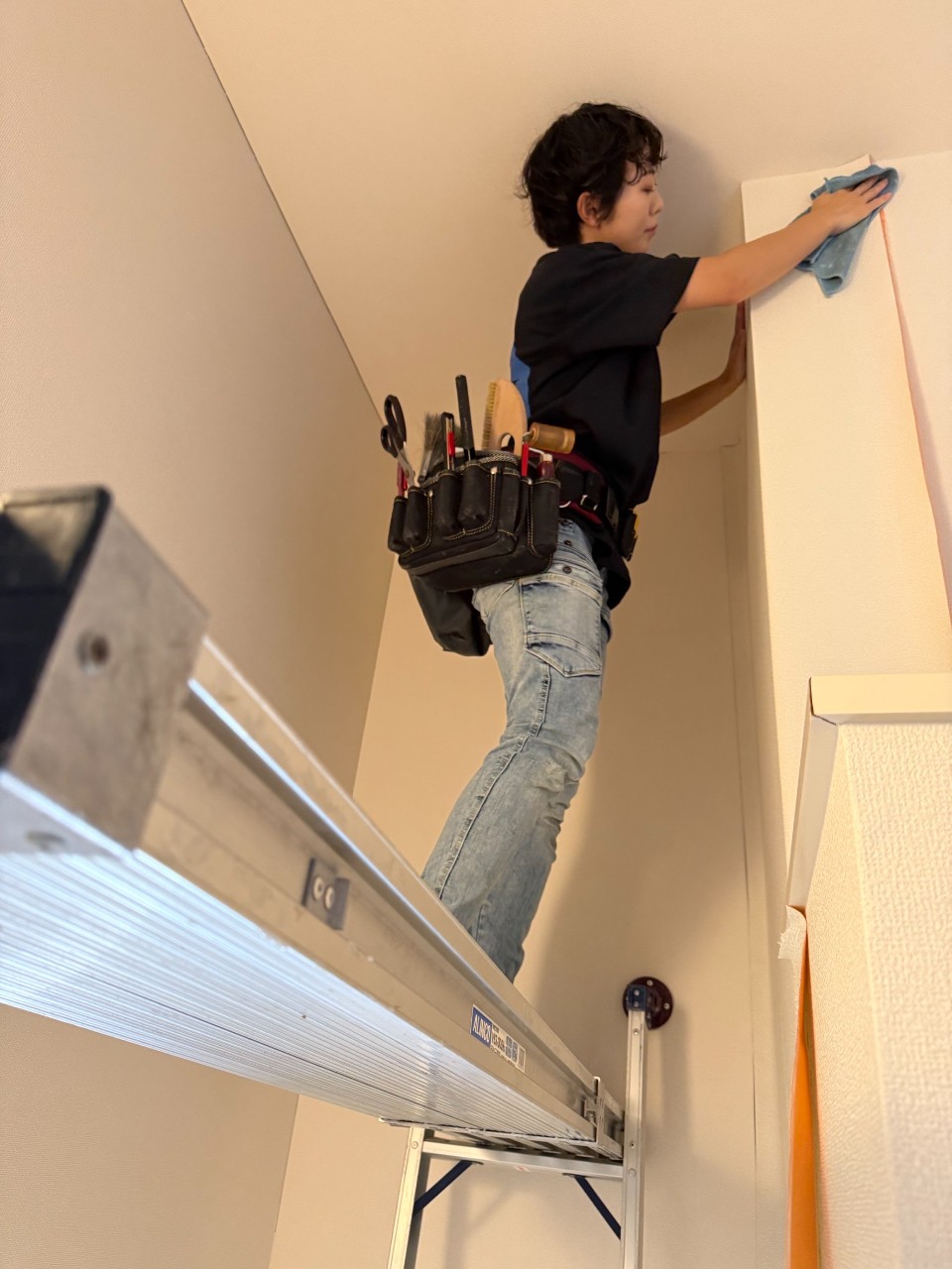 - 階段クロス張替工事。<div>若い現場女子活躍中!</div><div>女性ならではの目線で施工</div><div>丁寧かつきめ細やかな作業</div><div>仕上がりも綺麗です。</div><div>現場女子募集中!</div><div>リホーム・リノベーション際は何でもご相談下さい。</div><div><br></div>